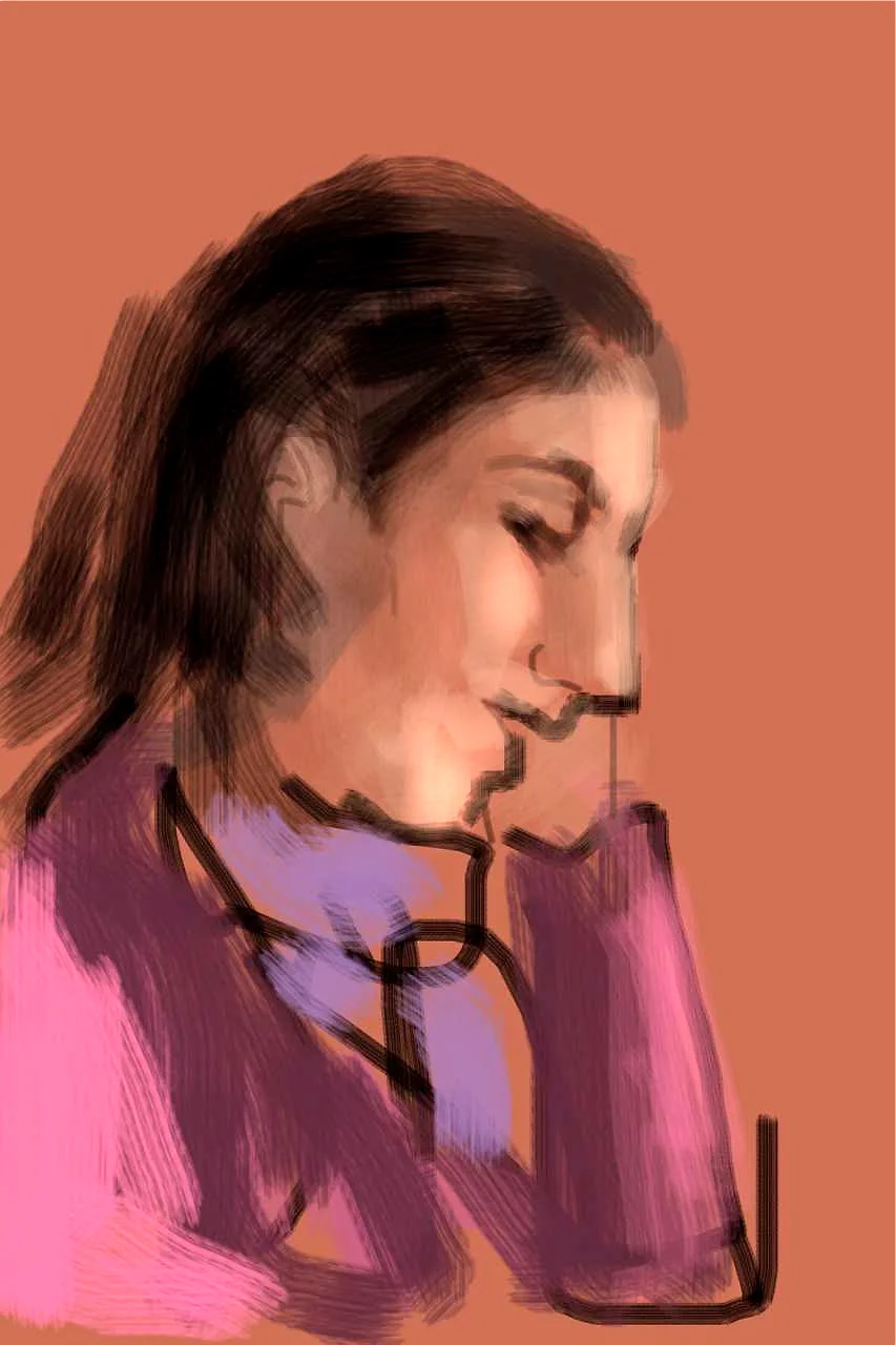 I adapted the swiftness of sumi brush painting, which you can see in my works on paper section, to the new medium of the iPhone. I furtively fingerpaint on the credit-card sized screen, capturing likenesses and characterizing individuals in my midst while hurrying slowly—with the relative slowness and humanity of the painted and drawn arts.